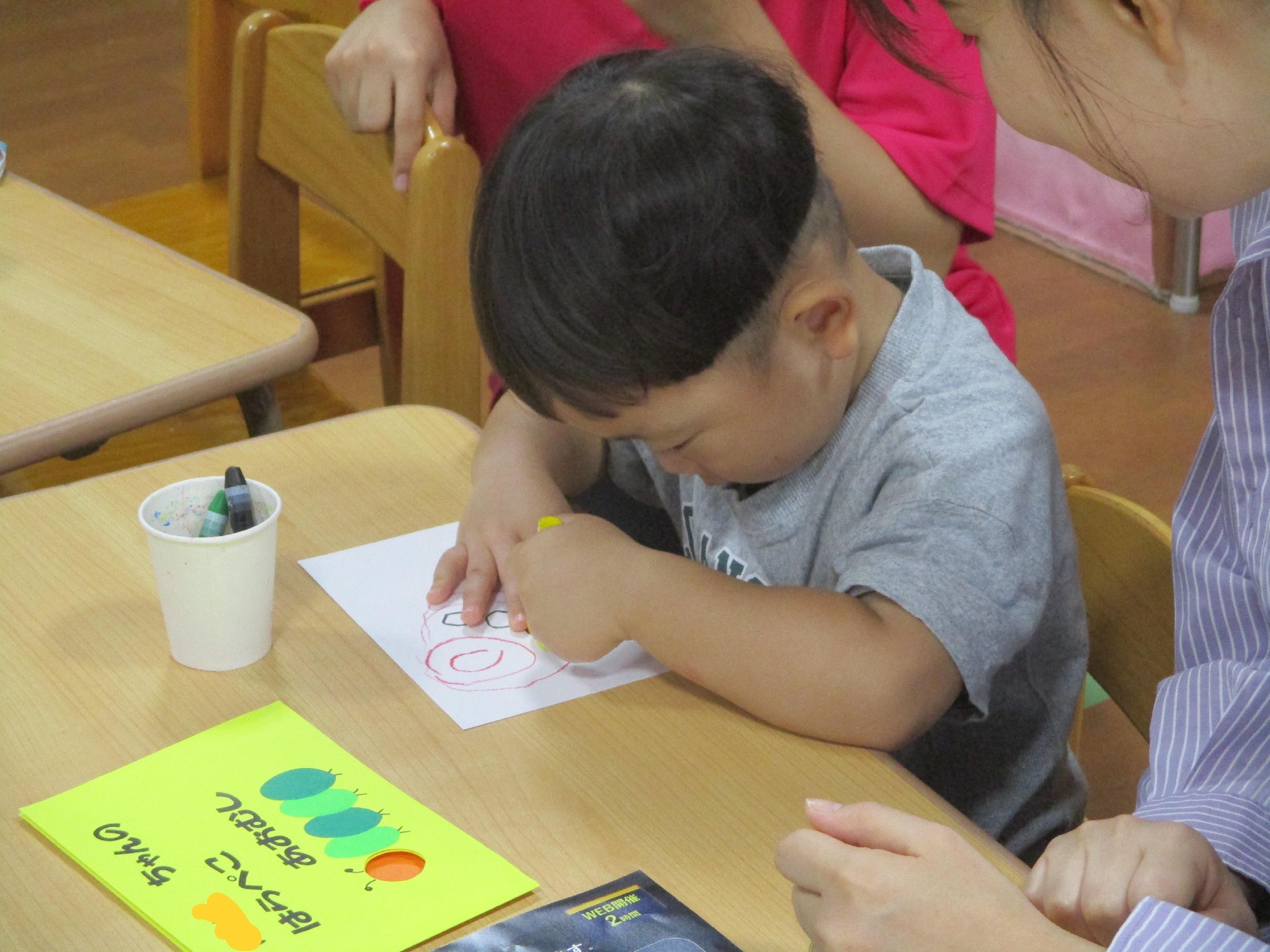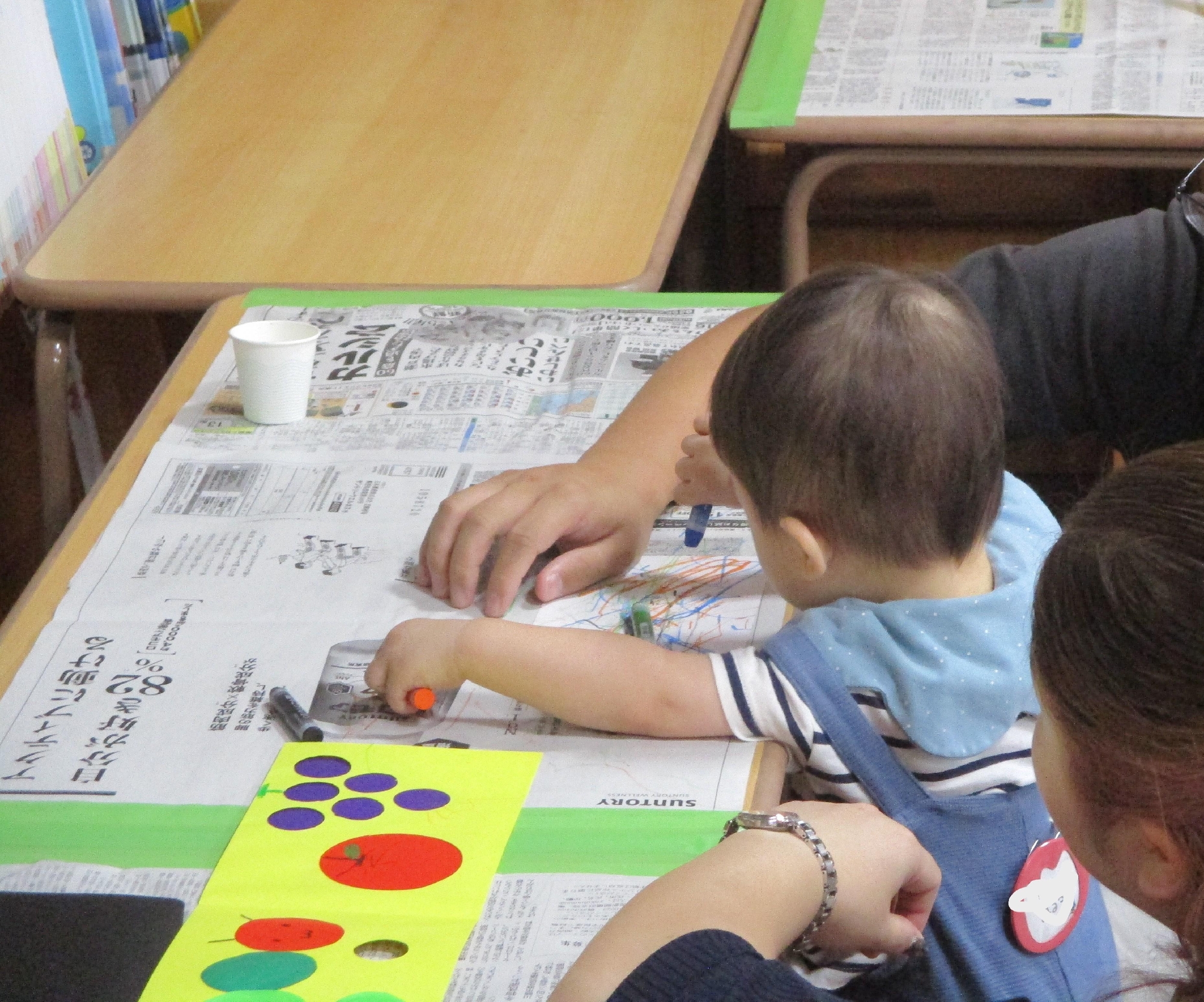 今日は、クレパスで色を塗ったり、色紙を貼ったり・・・