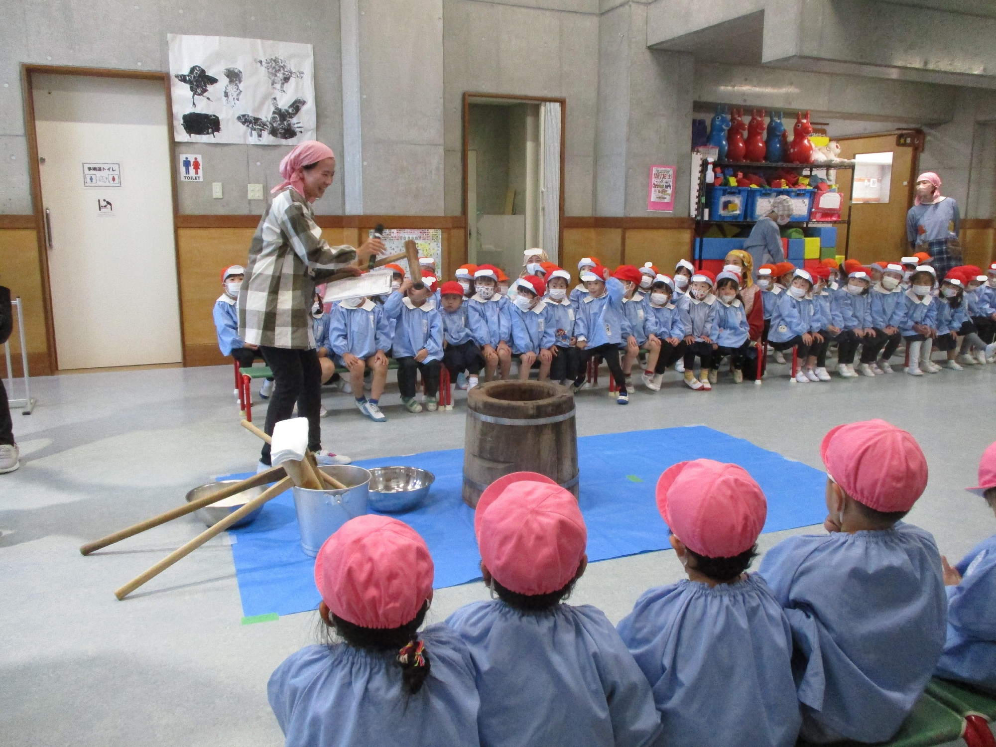 お子さまにとってはきっと、と~~~~っても大きく感じるであろう「臼と杵」を目の前にして、ひとりひとり「ぺったんこ、ぺったんこ」の掛け声に合わせておもちをつきました🥰