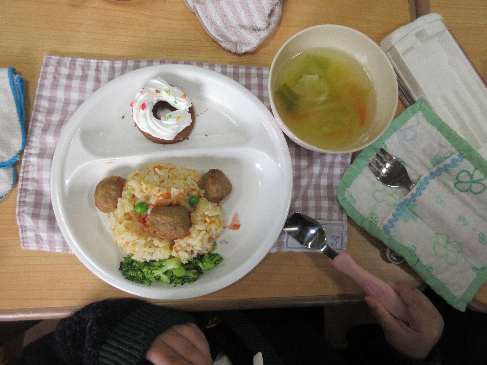 くまさんのピラフに、野菜スープ、焼きドーナツにはホイップも🤩